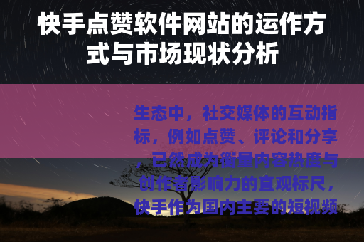 生态中,社交媒体的互动指标,例如点赞、评论和分享,已然成为衡量内容热度与创作者影响力的直观标尺,快手作为国内主要的短视频平台之一,其点赞数不仅是一种情感反馈,也在某种程度上关联着内容的传播广度与创作者的潜在收益,在这种环境下,一个围绕“快手点赞软件网站”的衍生市场悄然存在,这类网站通常宣称能够为用户提供快速增加视频点赞数量的服务,本文将就其常见运作模式、技术原理、用户动机以及相关行业背景进行阐述。