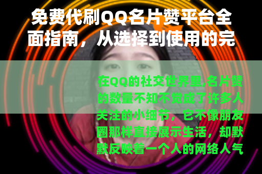 在QQ的社交世界里,名片赞的数量不知不觉成了许多人关注的小细节,它不像朋友圈那样直接展示生活,却默默反映着一个人的网络人气,看到别人的名片下点赞数成百上千,自己却寥寥无几,心里难免有些落差,一些用户开始寻找快速提升点赞数的方法,而免费代刷QQ名片赞平台就这样进入了视野,我不是什么网络专家,只是一个普通用户,最近出于好奇,尝试了几家这样的平台,想在这里分享一下我的经历和看法,这不是什么技术分析,也不是广告,只是随手记录,希望能给同样感兴趣的人一点参考。