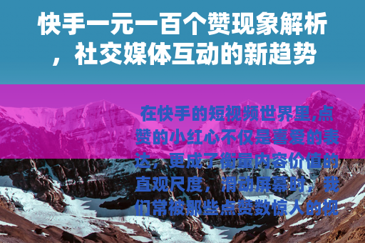 在快手的世界里,每一秒都有无数视频上传,每一刻都有点赞产生。“一元一百个赞”只是浩瀚数据流中的一滴水,但它激起的涟漪,让我们看到社交媒体互动的复杂面貌,无论你作为用户还是观察者,理解这一现象,都能帮助你在数字生活中找到更平衡的路径,毕竟,在虚拟的点赞背后,真实的生活和创作才是永恒的核心。