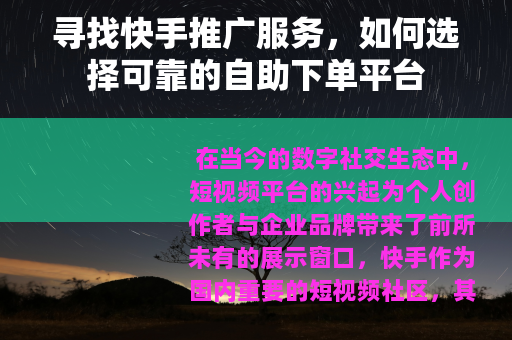 在当今的数字社交生态中,短视频平台的兴起为个人创作者与企业品牌带来了前所未有的展示窗口,快手作为国内重要的短视频社区,其活跃的用户基础与内容传播潜力,吸引了许多希望提升能见度的用户,对于部分创作者或运营者而言,借助外部服务来辅助内容推广,是一种常见的做法,市场上也因此出现了多种提供相关服务的平台,它们通常被称为“自助下单平台”,用户在选择时,往往希望以合理的成本获得有效的服务,其中价格因素成为考量的重点之一。