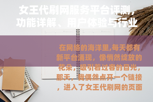 在网络的海洋里,每天都有新平台涌现,像悄然绽放的花朵,吸引着过客的目光,那天,我偶然点开一个链接,进入了女王代刷网的页面,屏幕上是简洁的布局,蓝色调的设计给人一种清爽感,服务列表排列整齐,从游戏等级提升到社交账号互动,似乎涵盖了网络生活的多个角落,我带着一丝好奇,开始了这次体验之旅,这不是一篇刻板的报告,而是像朋友聊天那样,说说这个平台带给我的感受,以及它为何能在众多服务中占有一席之地。