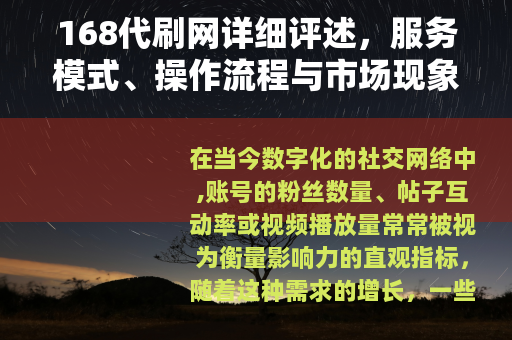 在当今数字化的社交网络中,账号的粉丝数量、帖子互动率或视频播放量常常被视为衡量影响力的直观指标,随着这种需求的增长,一些服务平台应运而生,旨在通过技术手段帮助用户提升这些数据,168代刷网便是其中之一,它作为一个提供代刷服务的平台,在市场上占据了一席之地,本文将以平实的笔触,深入描述168代刷网的服务内容、使用方式、技术背景及其在网络环境中的角色,避免空泛的论述,力求呈现一个客观的视角。