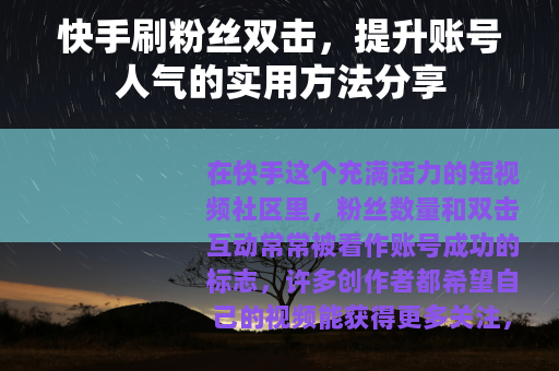 快手刷粉丝双击可以作为一种辅助手段,但它不该取代真实努力,在这个内容为王的时代,真诚的创作和互动才是吸引人的核心,通过平衡短期策略与长期投入,你的账号不仅能提升人气,还能在快手的广阔天地中找到属于自己的声音,每个双击背后都是一个可能的连接,而真正的影响力源于那些愿意停留和支持的观众。