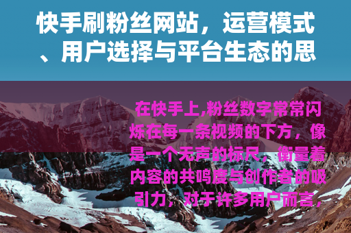 在快手上,粉丝数字常常闪烁在每一条视频的下方,像是一个无声的标尺,衡量着内容的共鸣度与创作者的吸引力,对于许多用户而言,这个数字不仅仅是一个统计——它关乎可见性、机会,甚至是一种社交资本,一些网站开始提供所谓的“刷粉丝”服务,承诺能快速填补那个数字的空缺,这种现象并非孤例,它像是一面镜子,反射出数字时代下人们对认可感的急切追求,以及平台生态中那些不那么显眼的角落,作为一个长期观察社交媒体趋势的作者,我想抛开常见的说教框架,以更平实的视角,聊聊这些快手刷粉丝网站的来龙去脉,以及它们如何嵌入用户的日常选择中。