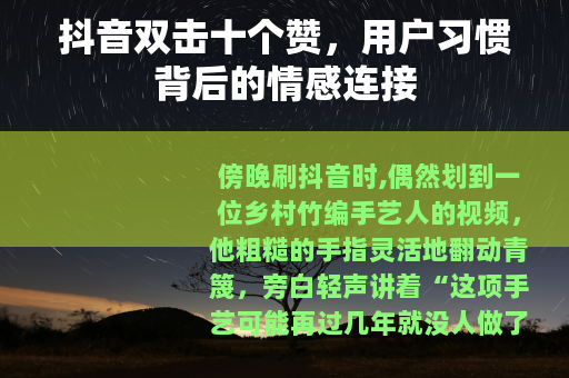 傍晚刷抖音时,偶然划到一位乡村竹编手艺人的视频,他粗糙的手指灵活地翻动青篾,旁白轻声讲着“这项手艺可能再过几年就没人做了”,我下意识地点了红心,连续双击屏幕——直到点赞图标跳出那个熟悉的“+10”特效,这动作并非刻意,反倒像一种本能:仿佛多按几下,就能把心里那点触动多分给他一些。