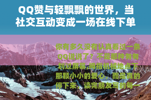 不是那种匆匆划过屏幕,拇指机械地点下那颗小小的爱心,而是真的停下来,读完朋友写的每一句话,感受他那一刻的情绪,或许是一张随手拍的夕阳,或许是一句没头没尾的抱怨,或许是一次平淡无奇的日常分享,你思考了一下,留下一个属于你的、带着温度的回应,在如今这个快得让人头晕目眩的时代,这种“认真”似乎成了一种奢侈,取而代之的,是一种更为高效、直接的方式:一串数字,一个代表“人气”的冰冷符号。“QQ说说赞在线刷网页版代刷”,这个听起来略带技术色彩的组合词,悄然潜入了一部分人的网络生活,它不是洪水猛兽,更像是一面镜子,映照出我们在这个数字社交时代,某种难以言说的、关于存在感与认同的微妙焦虑。