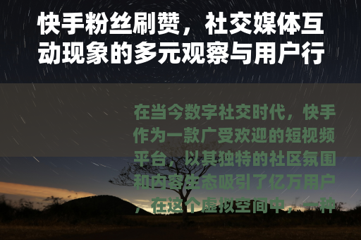 在当今数字社交时代,快手作为一款广受欢迎的短视频平台,以其独特的社区氛围和内容生态吸引了亿万用户,在这个虚拟空间中,一种被称为“粉丝刷赞”的行为逐渐浮现,成为用户互动中一个不容忽视的侧面,这种现象并非孤立存在,而是社交媒体发展过程中自然衍生的一种互动模式,它涉及用户心理、平台算法、社区文化等多个层面,本文将从多个角度对快手粉丝刷赞进行细致观察,旨在呈现其现状、动因及影响,而非进行简单评判,通过深入分析,我们希望为读者提供一个全面的视角,理解这一现象背后的社会逻辑与个人选择。