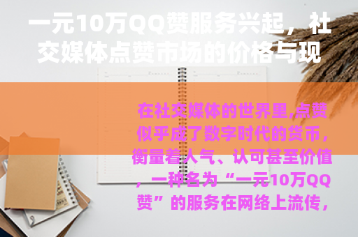 在社交媒体的世界里,点赞似乎成了数字时代的货币,衡量着人气、认可甚至价值,一种名为“一元10万QQ赞”的服务在网络上流传,吸引了众多用户的关注,只需支付微不足道的一元钱,就能在QQ空间或相关平台上获得十万个点赞,这种看似不可思议的交易,背后折射出社交媒体生态中的一些有趣趋势,本文将从这一现象出发,探讨其市场背景、运作方式、社会影响以及用户心理,希望能提供一个全面的视角。