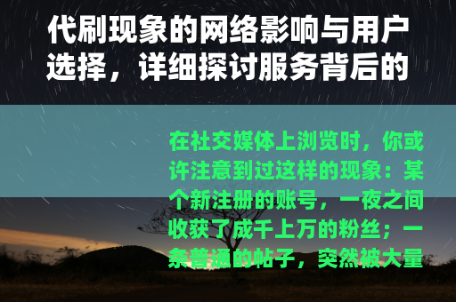 在社交媒体上浏览时,你或许注意到过这样的现象:某个新注册的账号,一夜之间收获了成千上万的粉丝;一条普通的帖子,突然被大量的点赞和评论淹没;或者,在游戏世界里,有些玩家似乎毫不费力地获得了稀有装备和高级等级,这些场景的背后,常常隐藏着一个关键词——代刷,代刷服务,顾名思义,是指通过第三方手段来替代用户完成某些网络行为,从而提升数据指标或获取虚拟资源,它不像传统广告那样直白,却悄无声息地渗透到我们的数字生活中,成为一种普遍但少被公开讨论的现象。