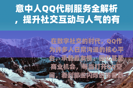 在数字社交的时代,QQ作为许多人日常沟通的核心平台,承载着友情、回忆甚至商业机会,每当打开QQ空间,看到那些闪烁的访客数字和点赞提示,我们都不免希望自己的社交形象能更亮眼一些,这种愿望催生了各种提升互动的方式,意中人QQ代刷”便是近年来备受关注的一种服务,它并非什么神秘事物,而是通过专业操作,帮助用户优化QQ账号的互动数据,从而增强社交影响力,我们就来聊聊这个话题,以平实的视角看看它如何融入普通用户的网络生活。