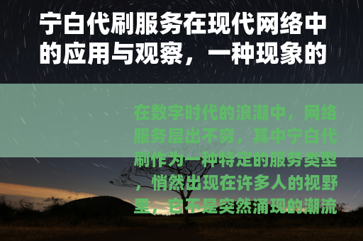 在数字时代的浪潮中,网络服务层出不穷,其中宁白代刷作为一种特定的服务类型,悄然出现在许多人的视野里,它不是突然涌现的潮流,而是随着网络生态的发展逐渐演化而来,作为一个长期关注网络现象的作者,我试图通过日常观察和对话,来描绘宁白代刷的轮廓,这不是一篇评判对错的论述,而是从一个中立的角度,记录这一现象如何渗透进我们的网络生活。