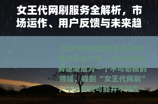 “女王代网刷”作为网络代刷服务的一个缩影,揭示了数字时代服务的多样性和实用性,它以实际案例告诉我们,网络需求如何催生创新解决方案,通过客观描述这一现象,我们不仅能更好地理解其运作逻辑,还能从中看到网络文化发展的一个侧面,在这个快速变化的环境中,代刷服务或许会继续演变,但其核心——为用户提供便利——仍将是一个值得关注的议题。