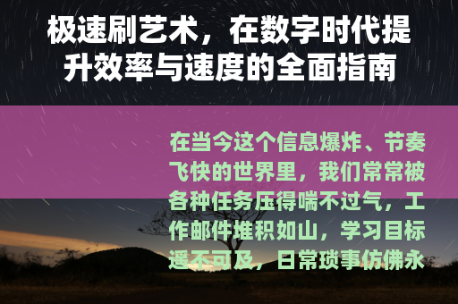 在当今这个信息爆炸、节奏飞快的世界里,我们常常被各种任务压得喘不过气,工作邮件堆积如山,学习目标遥不可及,日常琐事仿佛永无止境,这时,一种被称为“极速刷”的方法悄然兴起——它不是某种神秘捷径,而是一种融合技巧与智慧的高效实践,旨在用更短的时间达成更多目标,不同于那些浮于表面的快速方案,极速刷更像是一门艺术,强调通过优化流程、借助工具和调整心态,实现速度与质量的平衡,对于许多人来说,掌握极速刷意味着在个人成长和职业发展中抢占先机,而这背后,是无数人如何在忙碌中寻找从容的真实故事。
