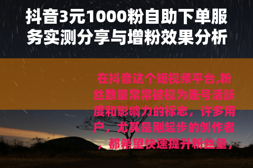 在抖音这个短视频平台,粉丝数量常常被视为账号活跃度和影响力的标志,许多用户,尤其是刚起步的创作者,都希望快速提升粉丝量,以便更好地展示内容或寻求合作机会,我注意到一种名为“抖音3元1000粉自助下单”的服务在网络上悄然流行,它声称能以极低价格帮助用户增加粉丝,出于好奇,我决定亲自尝试这项服务,并将整个过程记录下来,分享给可能感兴趣的朋友。
