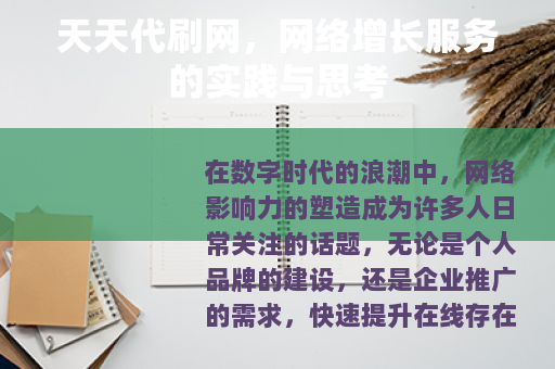 在数字时代的浪潮中,网络影响力的塑造成为许多人日常关注的话题,无论是个人品牌的建设,还是企业推广的需求,快速提升在线存在感的方法层出不穷,代刷服务作为一种辅助手段,逐渐走进大众视野,而“天天代刷网”作为这类平台中的一个代表,以其持续性和便捷性吸引了不少用户,本文将从实际使用出发,分享对天天代刷网的观察与体验,摒弃空泛论述,以真实视角探讨其服务模式与应用场景。
