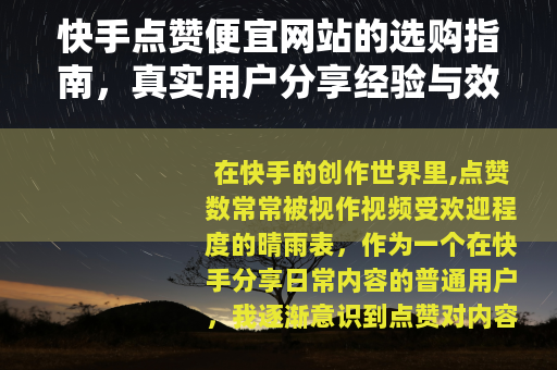 总结我的整个探索过程,使用快手点赞便宜网站是一段有价值的体验,它让我快速了解了数据驱动的推广逻辑,也让我认识到内容质量的不可替代性,对于其他创作者,如果你想尝试这类服务,建议从口碑较好的网站起步,先测试小额套餐,观察效果后再做决定,始终把创作放在首位,确保视频有独特价值,快手的生态充满机会,但只有那些坚持真实和创新的创作者,才能走得更远,希望我的分享能为你提供参考,帮助你在创作路上找到平衡与成长。