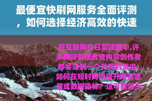 在互联网的日常运营中,许多网站管理者或内容创作者都会遇到一个共同的需求:如何在短时间内提升网站流量或数据指标?这可能源于新产品上线的推广压力,也可能是因为临时性的营销活动需要快速吸引眼球。“快刷网”服务应运而生——它通过技术手段模拟用户访问,帮助网站快速增加浏览量、点击量或其他交互数据,而对于预算有限的用户来说,“最便宜快刷网”成了搜索热点,人们希望以最小成本获取最大效果,但便宜是否意味着可靠?如何从众多选项中筛选出性价比高的服务?这篇文章将以真实用户的视角,抛开刻板结构,分享一些经验与思考。