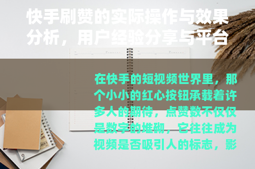 在快手的短视频世界里,那个小小的红心按钮承载着许多人的期待,点赞数不仅仅是数字的堆砌,它往往成为视频是否吸引人的标志,影响着内容在平台上的传播轨迹,作为一名快手用户,我注意到刷赞现象逐渐普及,于是决定亲自尝试,记录下整个过程,并分享我的观察与思考,这不是一篇教程,也不是评判,而是从一个普通用户的角度,探讨刷赞如何操作、带来什么效果,以及它在快手生态中的位置。