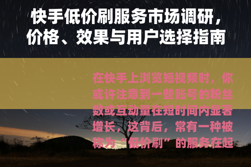 快手低价刷服务是一个复杂的话题,涉及用户心理、市场动态和平台生态,它既提供了便捷的解决方案,也带来了潜在问题,用户在选择时,应基于自身情况,权衡短期效益与长期发展,通过这种方式,我们不仅能更好地应对社交媒体的挑战,还能在数字世界中找到更可持续的成长路径。