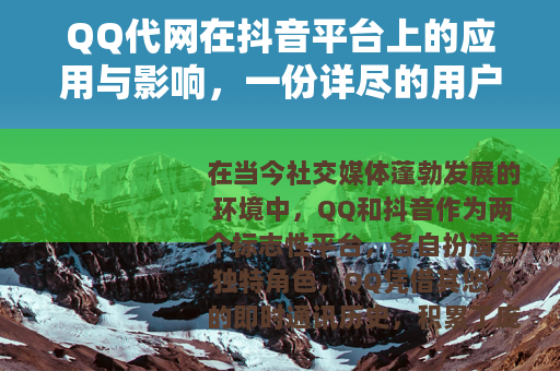 在当今社交媒体蓬勃发展的环境中,QQ和抖音作为两个标志性平台,各自扮演着独特角色,QQ凭借其悠久的即时通讯历史,积累了庞大的用户群体和丰富的社交功能;抖音则以短视频形式迅速风靡,成为内容创作和娱乐消费的热点,近年来,一种被称为“QQ代网”的用法在抖音用户中逐渐流行,这并非官方术语,而是用户在实践中形成的概念,指的是利用QQ的网络资源作为中介,来优化或辅助抖音的使用体验,本文将从实际角度出发,详细讨论这一现象的背景、应用方式和用户反馈,旨在为感兴趣的人提供全面而实用的信息。