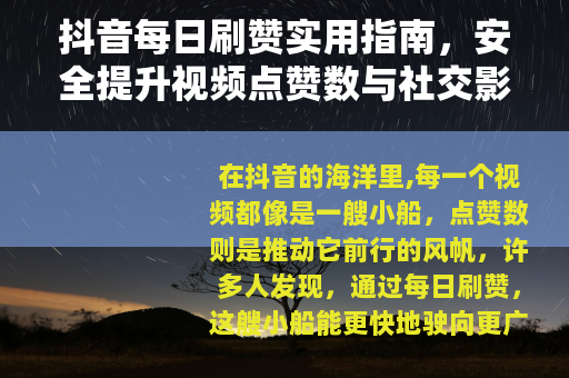 在抖音的海洋里,每一个视频都像是一艘小船,点赞数则是推动它前行的风帆,许多人发现,通过每日刷赞,这艘小船能更快地驶向更广阔的视野,但如何让风帆既有力又不会在风暴中折断,是每个舵手需要思考的问题,作为一个长期活跃在抖音上的用户,我想分享一些关于每日刷赞的经验和看法,希望能帮助你在这个平台上更稳健地航行。