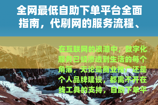 在互联网的浪潮中,数字化服务已经渗透到生活的每个角落,无论是商业推广还是个人品牌建设,都离不开在线工具的支持,自助下单平台作为一种新兴的服务模式,以其高效、便捷的特点,迅速赢得了用户的青睐,而代刷网,作为自助下单平台的一个细分领域,专注于提供代刷服务,如增加网站流量、提升社交媒体互动、优化电商销量等,成为许多用户快速实现目标的捷径,本文将以全网最低自助下单平台为焦点,结合代刷网的实际案例,深入探讨其运作方式、使用体验以及如何选择适合的平台,旨在为用户提供一份实用的参考。