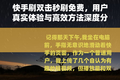 记得那天下午,我坐在电脑前,手指无意识地滑动着快手的页面,作为一个普通用户,我上传了几个自认为有趣的短视频,但播放量和双击数始终寥寥无几,朋友们调侃说,我的内容像是沉进了大海,连个涟漪都看不见,出于好奇,我在搜索框里输入了“快手刷双击秒刷免费”这几个字——没想到,这竟开启了一段意想不到的体验,起初,我只是想试试看,能不能给视频加点热度,让更多人注意到,但随着时间的推移,我逐渐发现,这个看似简单的操作背后,藏着不少用户的故事和实用技巧,我想把这些分享出来,就像和朋友聊天一样,聊聊那些真实的使用感受,以及如何在这个过程中找到适合自己的方式。