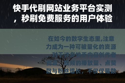 在如今的数字生态里,注意力成为一种可被量化的资源,对于许多快手内容创作者而言,视频的播放量、点赞数与粉丝增长,不仅仅是数字,更是一种可见的反馈与社交资本,在这种普遍需求下,网络上逐渐出现了一批提供所谓“快手代刷业务”的平台,它们常以“秒刷”、“免费体验”等字眼吸引用户,这些平台是如何运作的?用户的实际体验又是什么样的?我们不妨从一个普通寻求者的视角,走近这个领域。