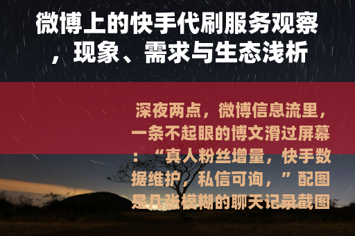 深夜两点,微博信息流里,一条不起眼的博文滑过屏幕:“真人粉丝增量,快手数据维护,私信可询。”配图是几张模糊的聊天记录截图,显示着“已交付”、“满意”等字眼,没有夸张的感叹号,没有喧闹的广告板,这条博文安静地躺在某个数码博主的转发队列里,像一块不起眼的灰色砖石,嵌在社交媒体庞大的墙体之中,这不是我第一次,也绝不会是最后一次,在微博的角落瞥见这类与“代刷快手业务”相关的讯息,它们似乎自成一片生态,有自己的语言、逻辑和生存方式。