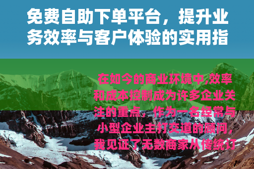 在如今的商业环境中,效率和成本控制成为许多企业关注的重点,作为一名经常与小型企业主打交道的顾问,我见证了无数商家从传统订单管理方式转向数字化工具的历程,免费自助下单平台逐渐成为热门选择,它不仅简化了流程,还为客户带来了便利,我遇到了一位经营手工艺品店的创业者张先生,他的故事让我对这种平台产生了更深兴趣,过去,张先生依靠纸笔记录订单,常常漏单或混淆客户需求,导致投诉不断,但自从他尝试了一个免费自助下单平台后,订单处理变得井井有条,客户反馈也转为积极,这种转变并非偶然,而是免费自助下单平台价值的体现,本文将围绕这一主题,从实际应用出发,探讨其功能、优势、使用方法和未来趋势,旨在为商家提供一份详尽的参考,帮助他们在竞争中找到更高效的运营路径。