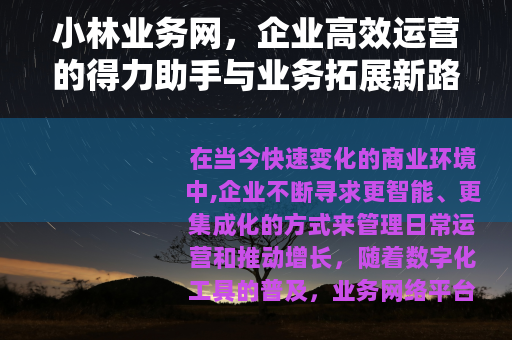 小林业务网作为一个综合业务服务平台,已经证明了自己在提升企业运营效率方面的价值,通过其起源故事、核心功能、实际案例和用户反馈,我们可以看到它如何从简单工具演化为可靠伙伴,它不依靠夸张宣传,而是以实用性和适应性赢得市场,对于那些寻求优化业务管理的企业来说,小林业务网提供了一个值得考虑的选择——它不是万能解决方案,但能在许多场景中带来积极变化,在快速变化的商业世界中,这样的工具帮助我们更专注于核心事务,让业务运行更加平稳和高效,随着技术不断发展,我们期待看到小林业务网如何继续演进,为更多企业创造机会。