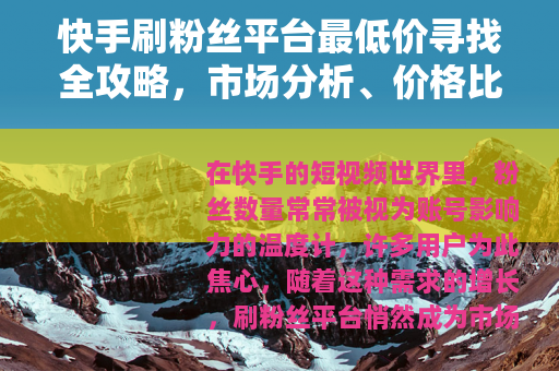 寻找快手刷粉丝平台的最低价格是一个综合考量的过程,通过理解市场机制、比较价格因素、借鉴用户经验,用户可以做出更明智的选择,在这个过程中,保持理性态度,平衡价格与质量,才能实现最佳效果,快手的世界里,粉丝数或许能点亮一时的星光,但真正持久的闪耀,终究来自真实的内容和互动,愿每一位创作者在追求增长的路上,既能找到经济的助力,也不忘初心,踏实前行。
