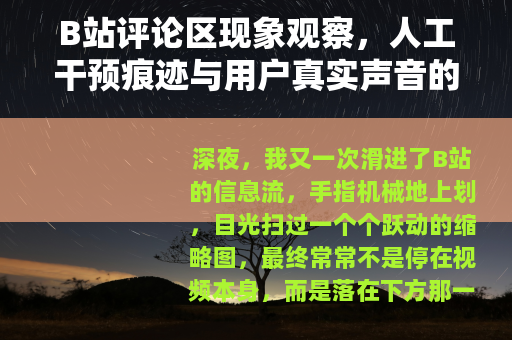 深夜,我又一次滑进了B站的信息流,手指机械地上划,目光扫过一个个跃动的缩略图,最终常常不是停在视频本身,而是落在下方那一片不断滚动的评论区里,那里时而热闹如市集,金句频出,梗图乱飞;时而又会出现一片整齐划一的赞美,或是一段段似曾相识、措辞精致的段落,像是精心排练后的合唱,这已经是许多B站用户,包括我在内,熟悉的日常景观了,我们似乎不再惊讶于某些视频下方,评论增长的速度偶尔会显得过于“澎湃”,或是某些账号总能用相似的句式,在不同的角落留下自己的脚印。