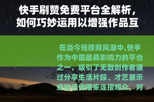 在当今短视频风潮中,快手作为中国最具影响力的平台之一,吸引了无数创作者通过分享生活片段、才艺展示或知识传播来连接观众,对于许多创作者来说,作品的点赞量不仅是人气的象征,更是推动内容进入更广泛推荐流的关键因素,随着需求增长,一种称为“刷赞免费平台”的服务逐渐进入公众视野,它们承诺为用户提供免费的点赞增量,帮助作品在短时间内获得更多关注,本文将从实际角度出发,探讨这类平台的运作方式、用户体验、效果评估以及合理运用的策略,旨在为创作者提供一个全面的参考框架,而非简单的推广或否定,文章将避免使用空泛的论述,而是通过具体场景和案例,像一位经验丰富的作者那样,分享见解和建议。