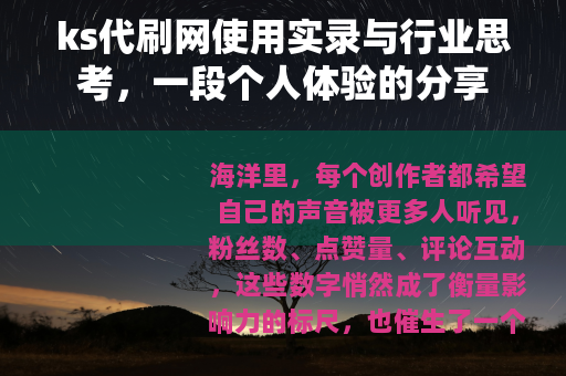 海洋里,每个创作者都希望自己的声音被更多人听见,粉丝数、点赞量、评论互动,这些数字悄然成了衡量影响力的标尺,也催生了一个灰色地带的服务——人们通常称之为“ks代刷网”,我并非行业专家,只是一个普通的快手用户,偶然间踏入了这个领域,经历了一些事,看到了一些现象,想以最平实的语言记录下来,这不是一份指南,也不是评判,仅仅是一次个人体验的延伸,或许能为你提供一点参考。