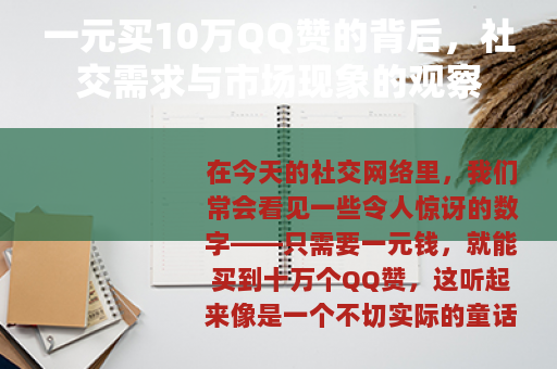 在今天的社交网络里,我们常会看见一些令人惊讶的数字——只需要一元钱,就能买到十万个QQ赞,这听起来像是一个不切实际的童话,但确实有不少人在提供或购买这样的服务,当我们放下那些常见的警惕或批判的视角,或许可以更平和地看看这个现象是如何产生、又反映了什么。