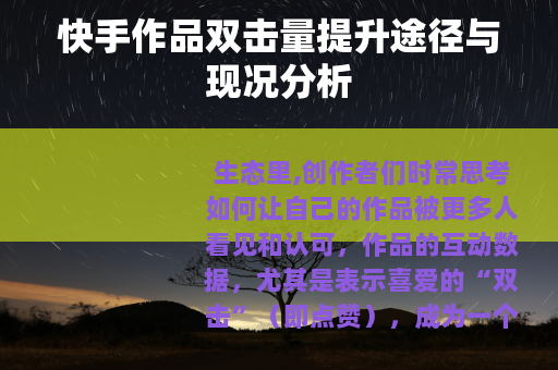 生态里,创作者们时常思考如何让自己的作品被更多人看见和认可,作品的互动数据,尤其是表示喜爱的“双击”(即点赞),成为一个受到普遍关注的指标,它影响着作品的基础曝光与传播潜力,也关联着创作者的即时反馈与动力,在这种普遍关注下,网络上出现了一些声称能够快速提升作品双击数量的技术服务网站,它们常以“下单秒刷”作为宣传点,形成了一个特定的、半公开的灰色领域。