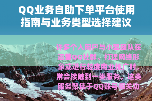 围绕QQ生态的自助下单平台,是网络服务细分化和便捷化趋势下的一个具体产物,它将原本可能零散、非标准的服务交易,整合进一个规范、透明的自助框架内,为用户管理自己的QQ数字资产提供了多一个便利的工具选项,随着网络社交形式的不断深化,这类专注于提升特定平台体验的服务模式,或许将继续演化,以适应不断变化的用户需求,对于有需要的用户而言,理解其运作逻辑,便能更有效地利用它来实现自己的小目标,无论是点亮一个怀旧的图标,还是为管理的社群账号增添一些特色功能。