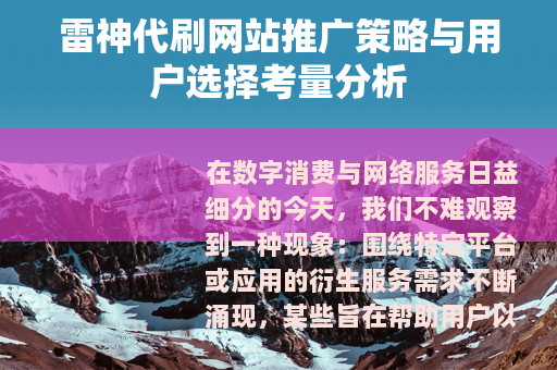 在数字消费与网络服务日益细分的今天,我们不难观察到一种现象:围绕特定平台或应用的衍生服务需求不断涌现,某些旨在帮助用户以非官方常规路径达成目标的服务,逐渐形成了一个独特的灰色地带,当我们提及“雷神代刷网站”及其推广行为时,我们实际上是在讨论一个存在于特定社群与市场缝隙中的现象,它并非孤立存在,而是与当前互联网生态中的用户心理、市场供需以及技术边界紧密相连,要理解这一现象,或许需要暂时搁置简单的道德评判,先从其生长的土壤、运作的逻辑以及它所触动的用户神经开始观察。