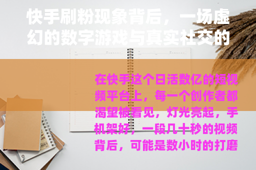 在快手这个日活数亿的短视频平台上,每一个创作者都渴望被看见,灯光亮起,手机架好,一段几十秒的视频背后,可能是数小时的打磨与期待,而当作品发布,那个代表关注人数的数字,便成了许多人心中挥之不去的焦点,一种灰色服务悄然滋生,它绕开了内容创作的艰辛,直指那个诱人的数字——这就是所谓的“刷粉”,它并非平台公告中的词汇,却真实存在于许多社群的隐秘角落,成了一些人难以言说的选择。