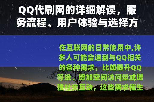 在互联网的日常使用中,许多人可能会遇到与QQ相关的各种需求,比如提升QQ等级、增加空间访问量或增强社交互动,这些需求催生了一些网络服务,其中QQ代刷网便是一个常见的选项,作为一个经常使用QQ的普通用户,我最初对这类服务感到好奇,于是花时间进行了了解,并和一些朋友交流了他们的经历,我想以分享的方式,谈谈QQ代刷网的相关内容,希望能为感兴趣的人提供一些参考。