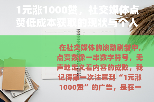 在社交媒体的滚动刷新中,点赞数像一串数字符号,无声地定义着内容的成败,我记得第一次注意到“1元涨1000赞”的广告,是在一个深夜浏览网页时弹出的窗口,那刻,我的好奇心被点燃了——这样的低价,如何能换来看似珍贵的社交认可?作为一个长期使用社交媒体的人,我开始观察这一现象,并思考它背后的故事,这篇文章不是要揭露什么,而是想以普通用户的视角,聊聊这种低成本点赞获取方式,如何在我们的数字生活中悄然蔓延。