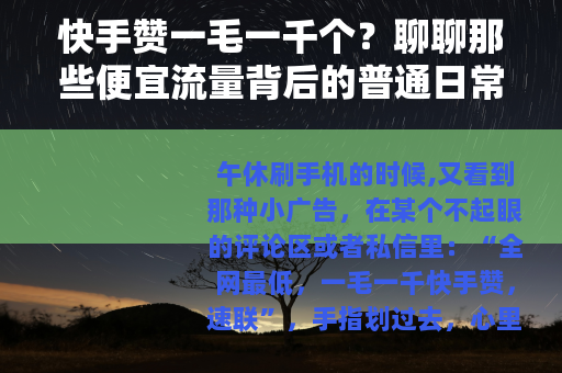 午休刷手机的时候,又看到那种小广告,在某个不起眼的评论区或者私信里:“全网最低,一毛一千快手赞,速联”,手指划过去,心里会微微顿一下,这个价格,便宜得像是街边流动摊贩的叫卖,它不轰轰烈烈,只是静静躺在那里,成了这个流量时代一个最普通的注脚。
