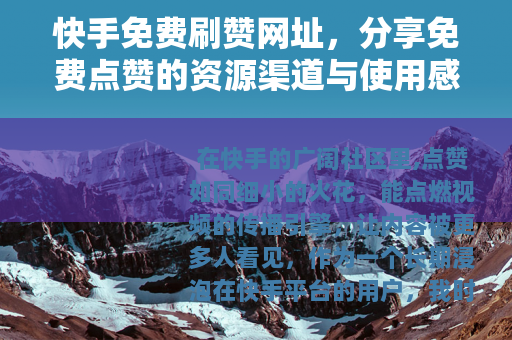 无论选择何种路径,记住快手的社区精神:分享、互动与成长,免费刷赞网址或许能为你打开一扇窗,但窗外风景的美丽,还得靠自己去描绘,在这个充满可能性的平台上,每一个点赞都值得珍惜,无论它来自何处,更重要的是背后的创作热情与观众共鸣,让我们继续在这个动态的世界里,探索属于自己的声音。