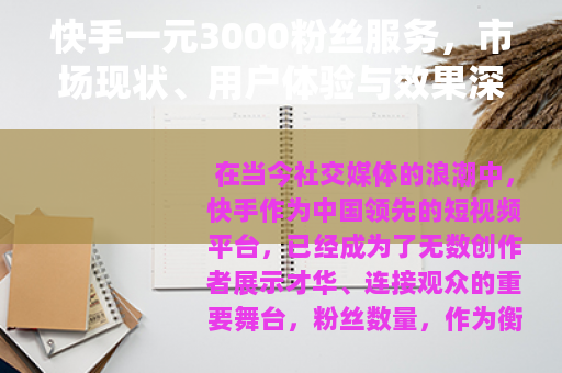 在当今社交媒体的浪潮中,快手作为中国领先的短视频平台,已经成为了无数创作者展示才华、连接观众的重要舞台,粉丝数量,作为衡量影响力和商业价值的一个直观指标,自然吸引了大量用户的关注,在这种背景下,一种被称为“一元3000粉丝”的服务悄然兴起——只需极低的成本,就能在短时间内获得数千粉丝,这听起来像是一个诱人的机会,但这种现象背后,究竟隐藏着怎样的故事?本文将通过市场观察、用户分享和实际数据,深入探讨这一服务的运作方式、效果反馈以及行业影响,旨在为读者提供一个全面的视角,而非简单的评判。