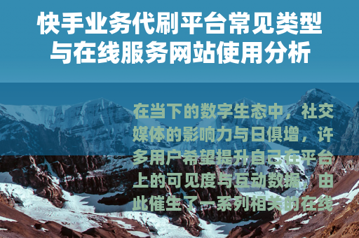 在当下的数字生态中,社交媒体的影响力与日俱增,许多用户希望提升自己在平台上的可见度与互动数据,由此催生了一系列相关的在线服务需求,在网络中,可以找到不少提供各类社交媒体数据服务的网站,其中涉及快手平台的业务也占有一定比例,这些网站通常以简便的操作和明确的服务项目吸引用户,我们不妨以一种平和的视角,来观察一下这类在线服务网站的存在形态与运作方式。