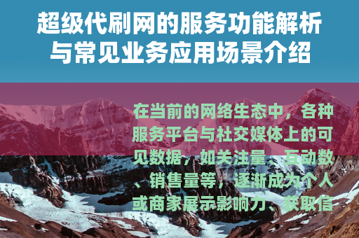 在当前的网络生态中,各种服务平台与社交媒体上的可见数据,如关注量、互动数、销售量等,逐渐成为个人或商家展示影响力、获取信任的重要参考,在此背景下,一类提供特定数据提升服务的平台应运而生,它们通常被用户称为“超级代刷网”,这类平台并非什么神秘组织,其本质是一种依托于自动化脚本或人工协作,为客户完成特定网络任务的服务集合。