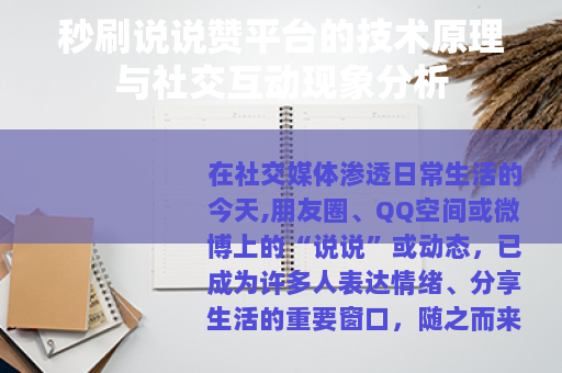 在社交媒体渗透日常生活的今天,朋友圈、QQ空间或微博上的“说说”或动态,已成为许多人表达情绪、分享生活的重要窗口,随之而来的,是互动数据——尤其是“点赞”——逐渐被赋予超出单纯认可的意义,它可能关乎一条心情的共鸣程度,也可能影响内容的热度排名,甚至在某些场合被视作人际影响力的参考指标之一,在这一背景下,“秒刷说说赞平台”作为一种衍生服务,悄然进入部分用户的视野。