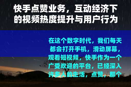 在这个数字时代,我们每天都会打开手机,滑动屏幕,观看短视频,快手作为一个广受欢迎的平台,已经深入许多人的生活,点赞,那个小小的心形图标,不仅是用户表达喜爱的方式,也悄然催生了一种现象——快手点赞业务,这不仅仅是一个简单的互动功能,它背后牵连着用户行为、内容创作和平台生态的复杂网络,我想和大家聊聊这个话题,从日常体验出发,看看点赞业务如何悄然改变我们的互动习惯。