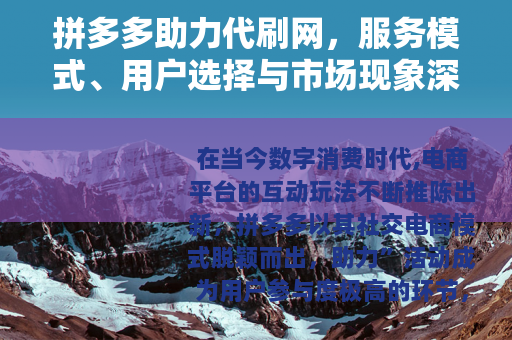 在当今数字消费时代,电商平台的互动玩法不断推陈出新,拼多多以其社交电商模式脱颖而出,助力”活动成为用户参与度极高的环节,从砍价免费拿到团购优惠,这些活动依赖用户分享链接邀请好友助力,形成裂变式传播,随着活动普及,一种衍生服务——助力代刷网——悄然兴起,为用户提供替代性助力解决方案,本文将从拼多多助力代刷网的运作方式、用户动因、市场现状及行业影响等方面展开分析,通过具体案例和数据,呈现这一现象的多维面貌。